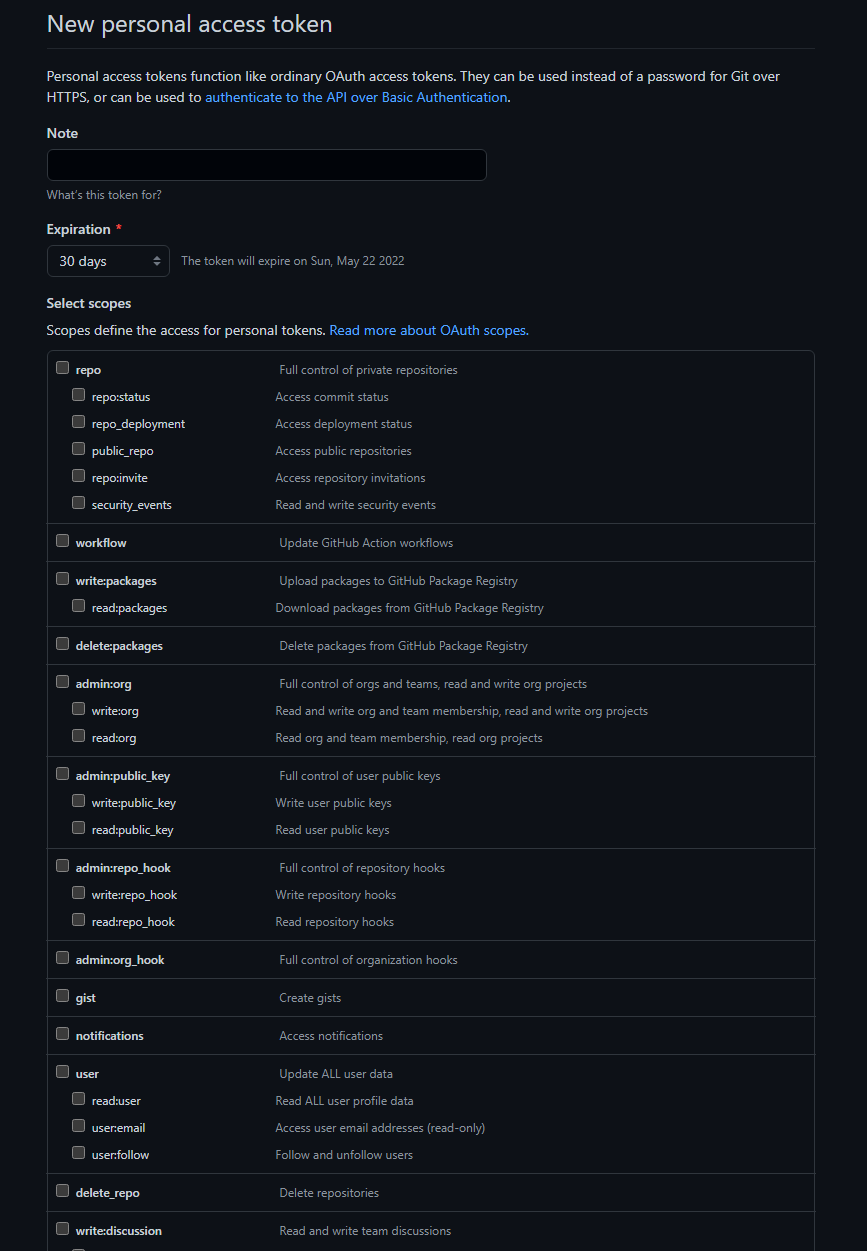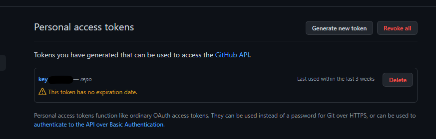 Github에는 api token을 이용하여 접근할 수 있는 API가 있다. Personal access tokens 페이지에서 권한 및 기한을 지정하고 토큰을 생성할 수 있으며, 레포지토리의 종류에 따라 더 많거나, 적은 권한이 필요하며, 권한에 대한 범위 설명은 여기에서 확인 가능하다.