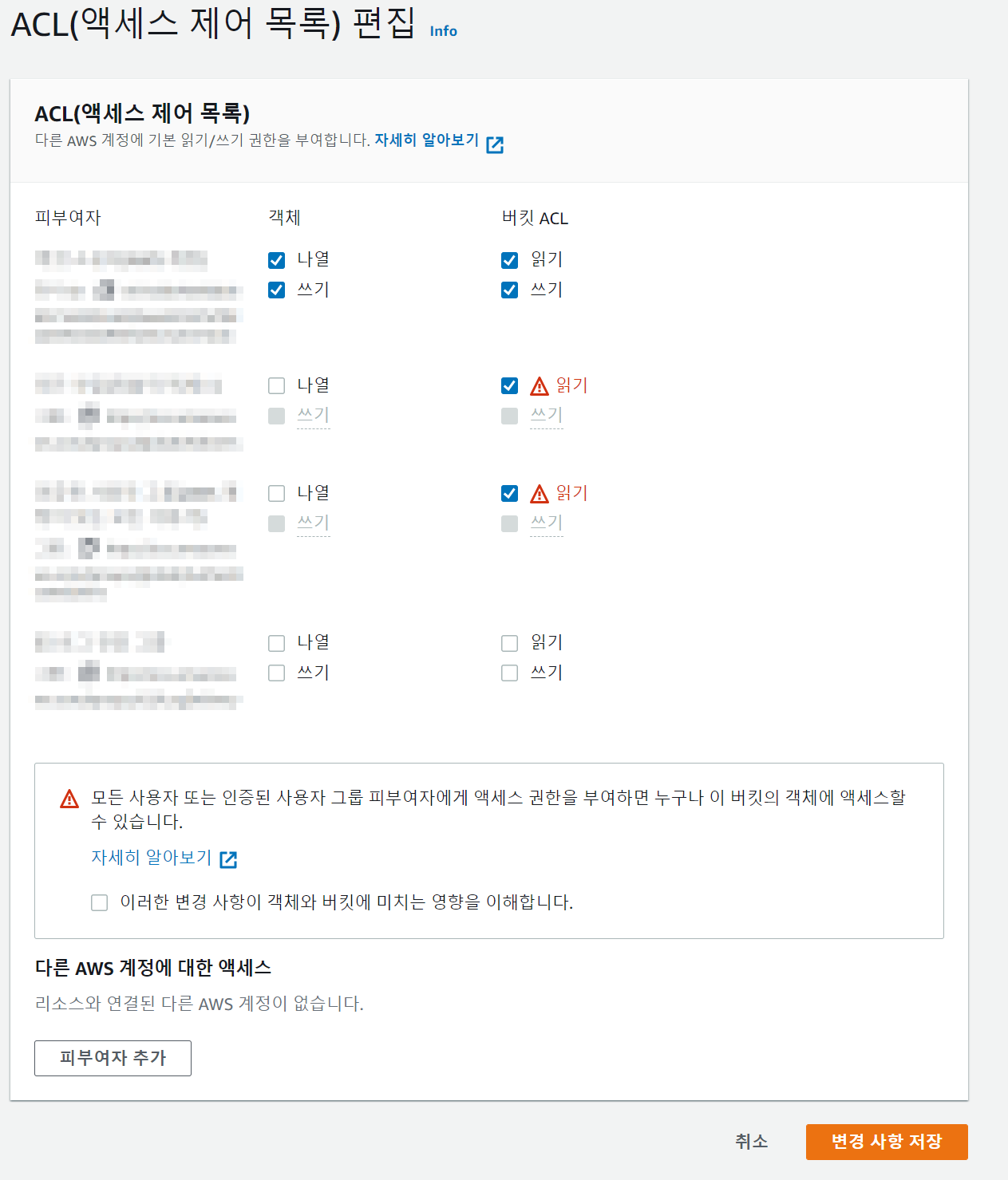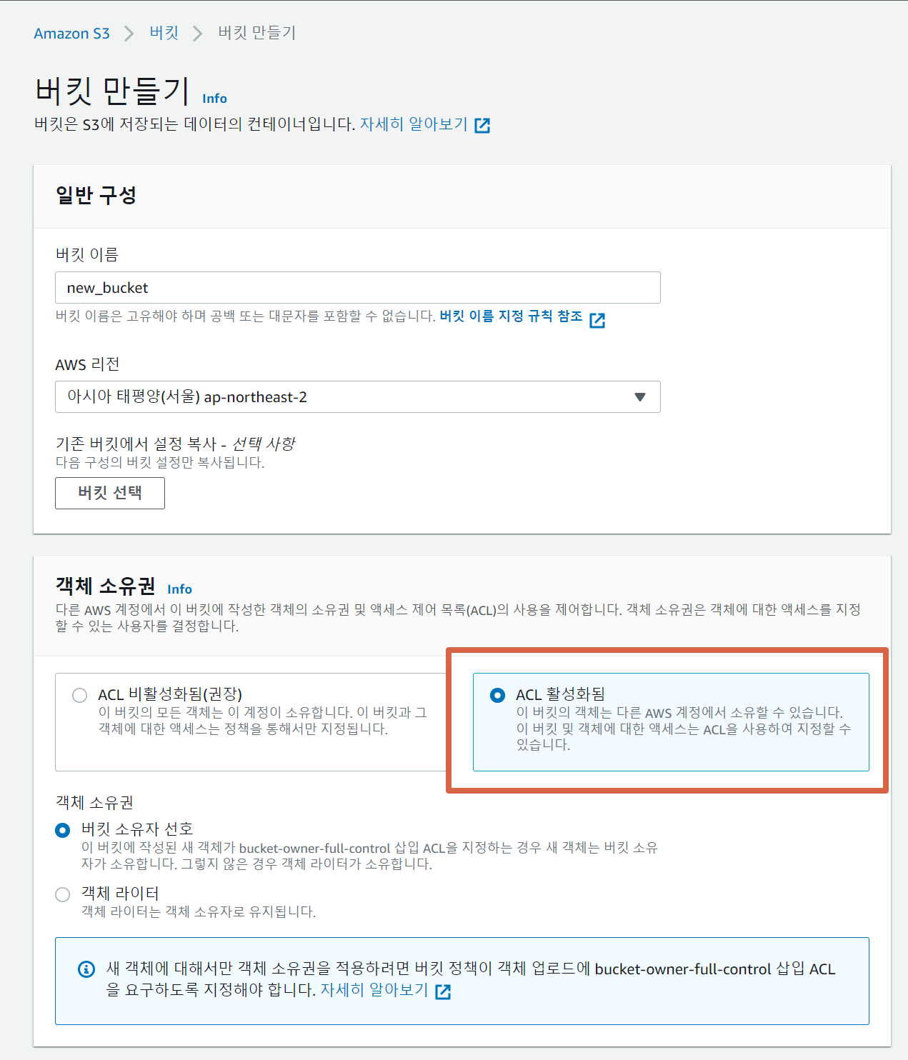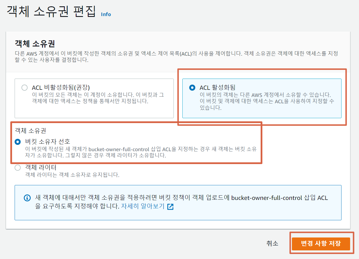 - 객체 소유권에서 ACL 활성화 : 버킷 소유자 선호