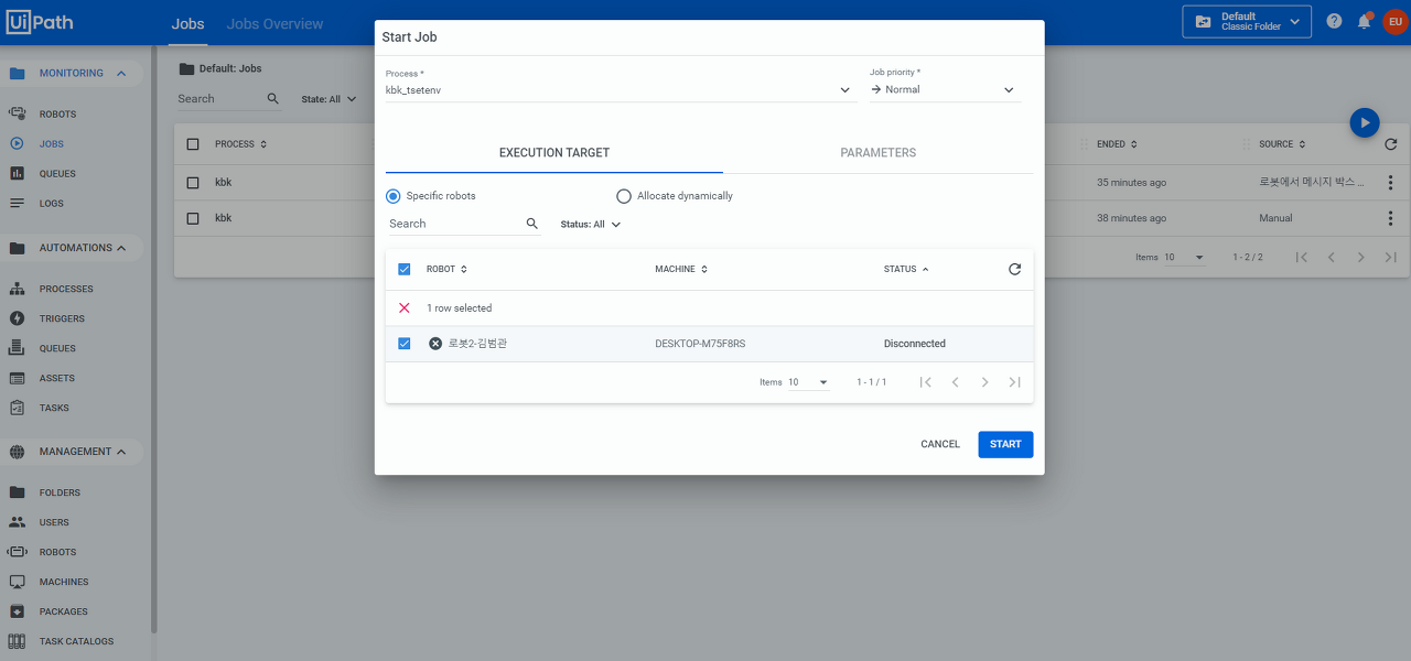 process 선택 (패키지 + 로봇환경 조합)