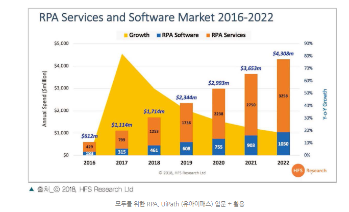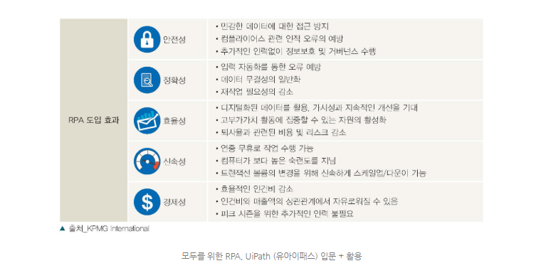 하지만 RPA는 투자 및 운영비용이 낮고 맞춤형 소프트웨어나 정교한 시스템 통합이 필요 없다는 장점이 있어서 작업자의 짧은 교육으로도 쉽게 구현할 수 있기 때문에 성장을 추구하는 기업에 아주 중요하다.