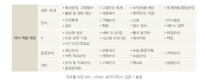 RPA는 기업활동의 모든 분야 모든 업무가 대상이라고 해도 과언이 아닐 만큼 폭 넓은 적용분야를 가지고 있다.