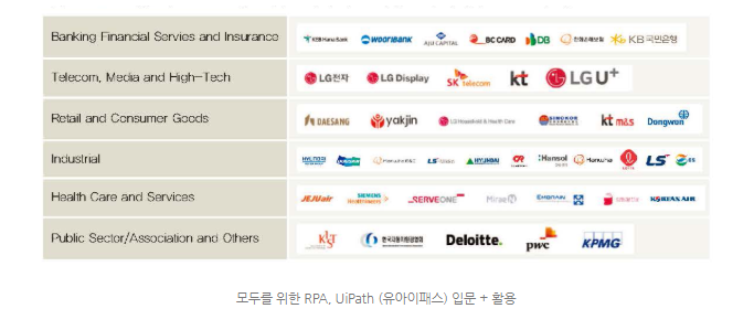 다음은 RPA 제품 중 UiPath를 도입한 국내 주요 기업 현황이다.(2018년 기준)