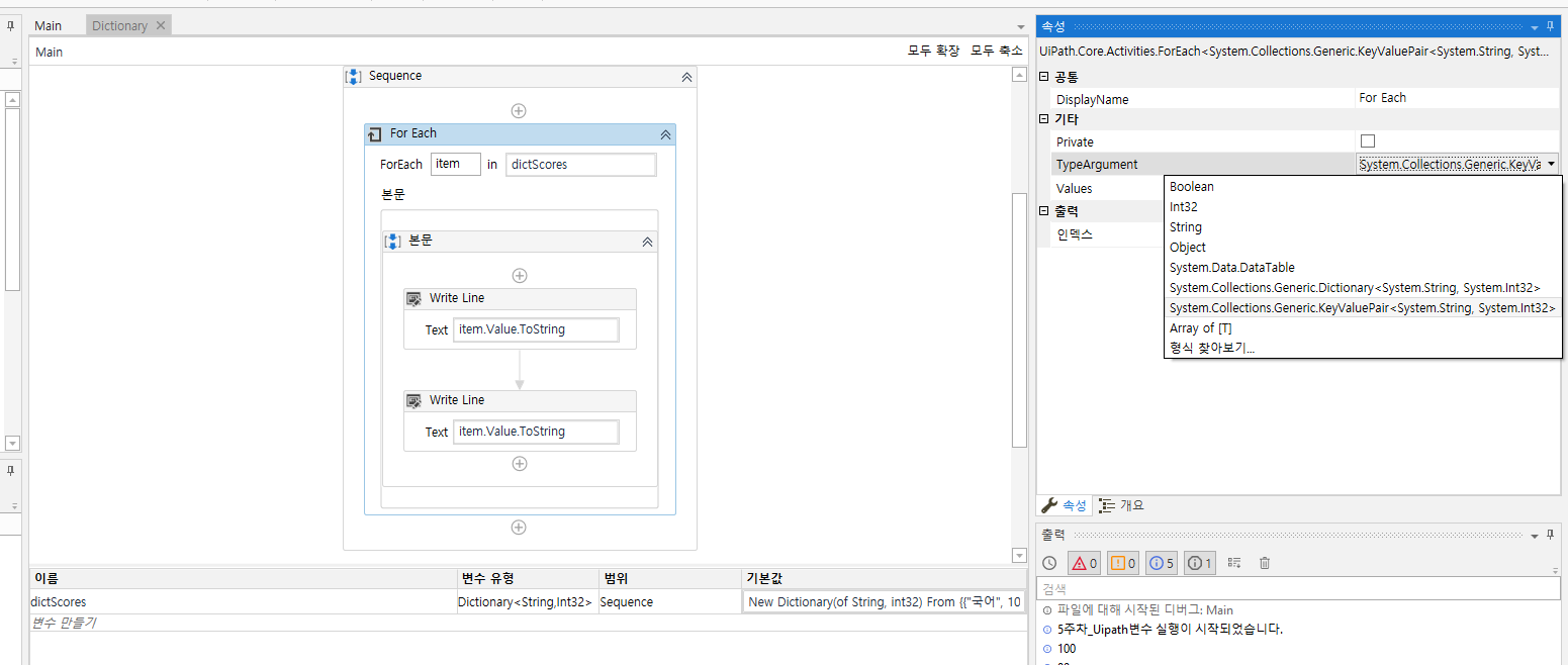 딕셔너리 유형의 타입을 반복문으로 돌리기 위해서는 TypeArgument를 System.Collections.Generic.KeyValuePair로 선택하는 것이 좋다. 이렇게 하면 딕셔너리에 있는 Key와 Value 값을 모두 가져올 수 있다.