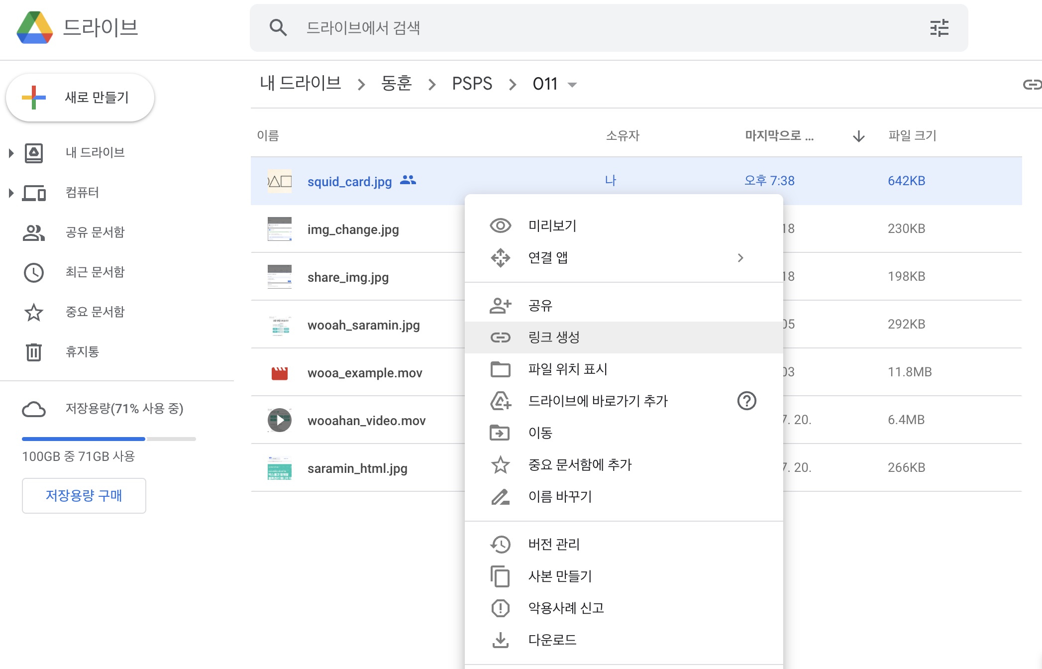 해당 이미지 파일을 오른쪽 클릭해서 [링크 생성]을 누르세요. 그러면 누구에게나 공유 가능한 이미지 링크를 볼 수 있는데 여기서 구글 드라이브 파일 경로의 ID값만 복사할게요